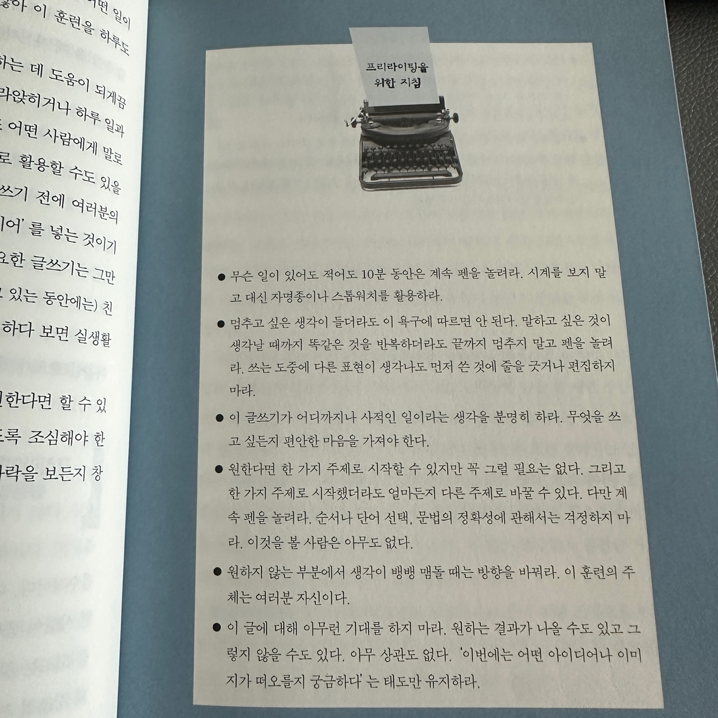 베이그는 글쓰기에 앞서 몇 가지 기본 원칙을 제시합니다. 이 원칙들은 글쓰기를 대하는 마음가짐부터 바꿔줍니다.